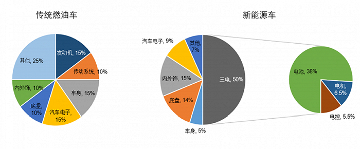 根據(jù)高工機(jī)器人數(shù)據(jù),在燃油車(chē)成本構(gòu)成中,發(fā)動(dòng)機(jī)、車(chē)身與汽車(chē)電子占比最高,均為15%,底盤(pán)、傳動(dòng)系統(tǒng)分別占比10%;而在電動(dòng)車(chē)中,“三電”系統(tǒng)占比高達(dá)50%,其中電池占比最高,為38%,電機(jī)占比6.5%,電控占比5.5%。