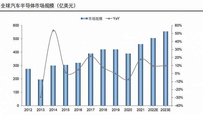 根據(jù)Gartner 和Statista數(shù)據(jù),2012年以來(lái),全球汽車(chē)半導(dǎo)體規(guī)模整體呈上升趨勢(shì),2020年受疫情影響僅有390億美元,受益新能源車(chē)滲透率提升,預(yù)計(jì)到 2023年,全球汽車(chē)半導(dǎo)體市場(chǎng)規(guī)模將達(dá)到555億美元。