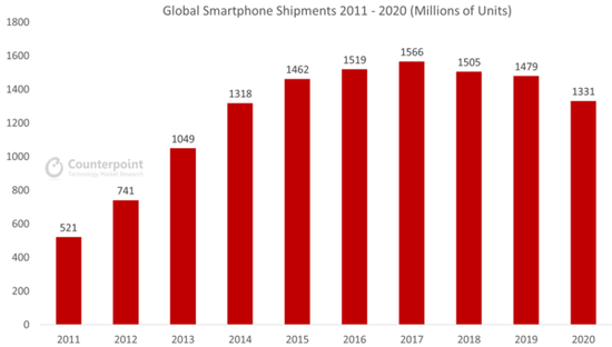 變化在2018年時已開始顯現(xiàn)。根據(jù)市場調(diào)研機構(gòu)Counterpoint數(shù)據(jù),全球智能手機的出貨量自2017年達(dá)到15.66億臺的高點后,出現(xiàn)了連續(xù)三年的下跌,到2020年,全球智能手機的出貨量已低至13.31億部,幾乎與2014年的智能手機市場持平。
