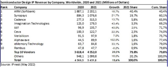 波動從硬件傳到了芯片設(shè)計IP領(lǐng)域。據(jù)世界半導(dǎo)體貿(mào)易協(xié)會(WSTS)的統(tǒng)計數(shù)據(jù)顯示,2021年全球設(shè)計IP銷售額為54.5億美元,同比增長19.4%,雖然代表智能手機行業(yè)的ARM市場份額占據(jù)了大頭,為40.4%,國際EDA巨頭Synopsys與Cadence分列二三,但是相比ARM在2016年占據(jù)的48.1%市場份額,占比已然是下跌了不少。