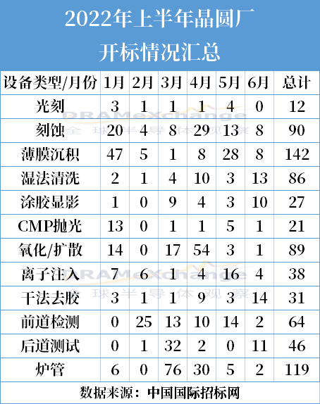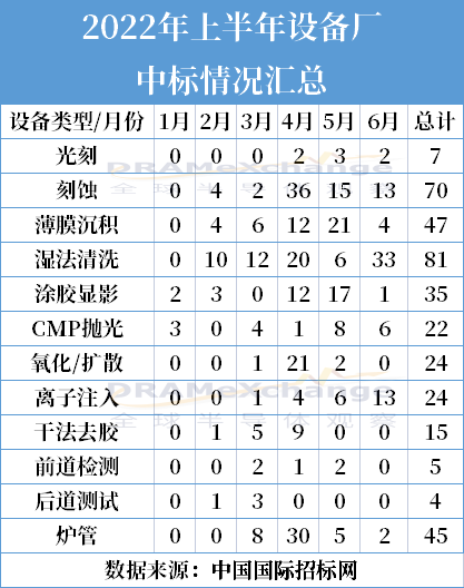 從開標(biāo)數(shù)據(jù)看,2022 年上半年國內(nèi)主要晶圓廠共開標(biāo)765臺工藝設(shè)備,其中清洗設(shè)備86臺,數(shù)量排名第五。
