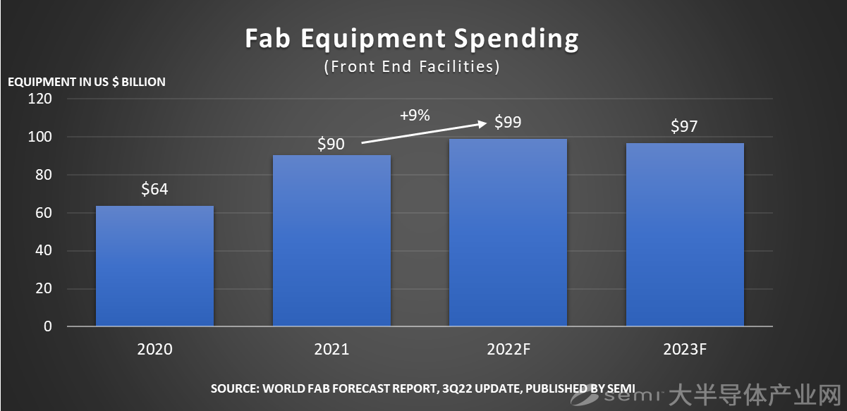 美國加州時間2022年9月27日,SEMI在其最新的季度《世界晶圓廠預(yù)測報(bào)告》(World Fab Forecast)中宣布,2022年全球晶圓廠設(shè)備支出預(yù)計(jì)將同比增長約9%,達(dá)到990億美元的歷史新高。