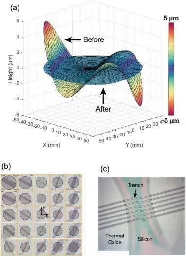 (a)在圖案化過程之前(S形)和之后(平面形)測量的晶圓表面。(b)用于平整晶圓表面的25個單元的顯微鏡圖像。(c)兩個單元之間區(qū)域的顯微鏡圖像。