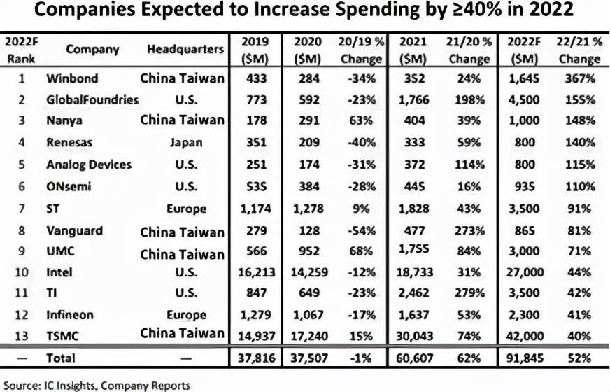 上圖中13家公司的總支出預(yù)計(jì)將是兩年前2020年的近2.5倍。支出的大幅度增長,主要是由于當(dāng)前市場激增的需求導(dǎo)致的供不應(yīng)求,未來隨著需求的逐步被滿足,未來半導(dǎo)體公司的支出根據(jù)銷售情況會進(jìn)行調(diào)整。